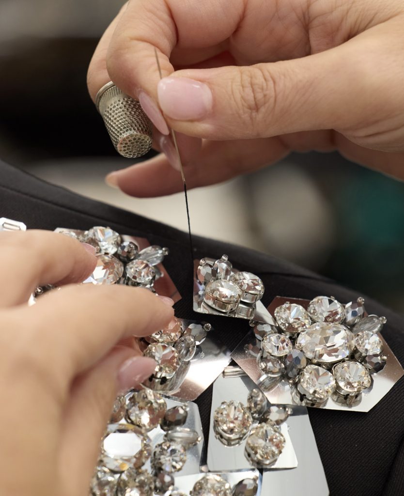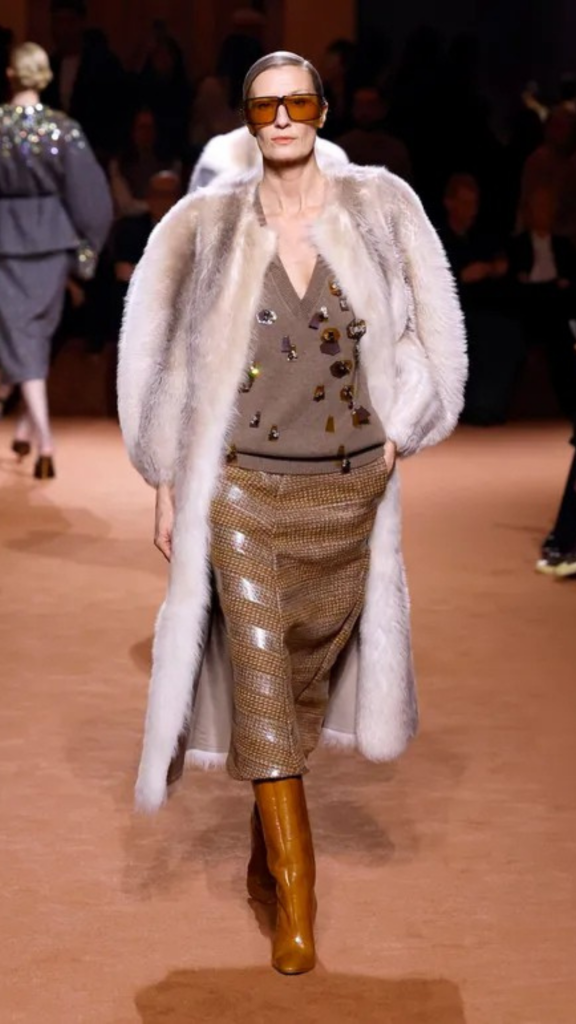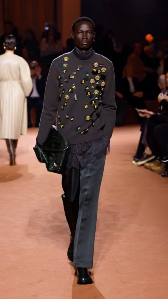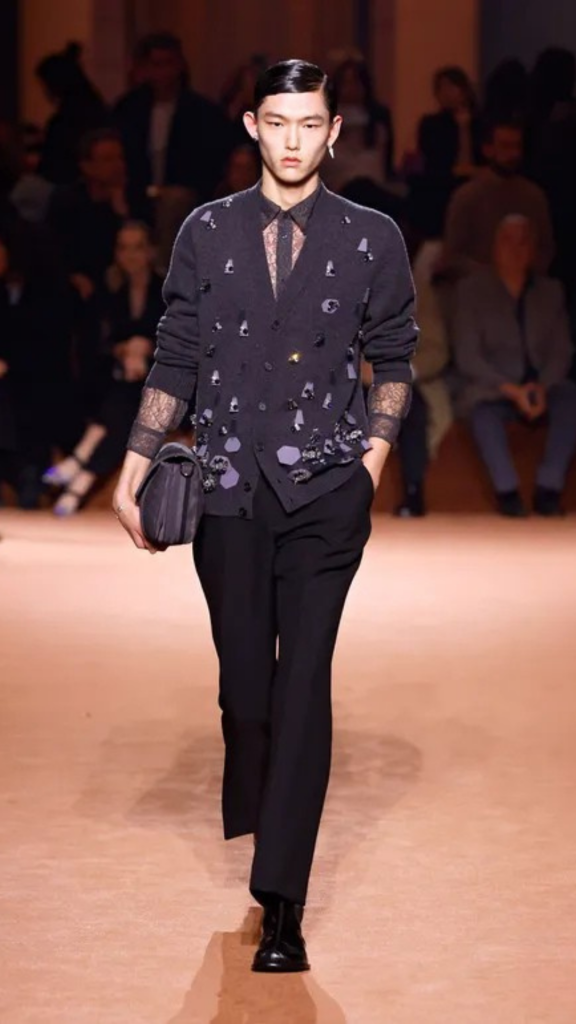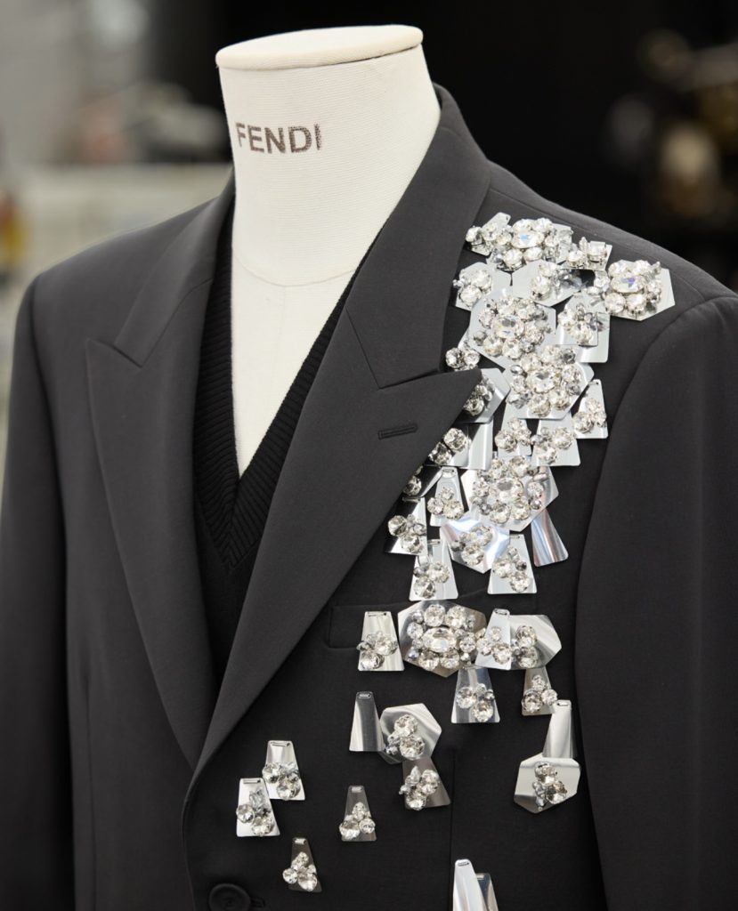 L’ensemble dominé par une veste noire ornée de cristaux illustre à la perfection la précision et l’excellence du travail de la maison. Les détails appliqués un à un, apportent une dimension sculpturale à la pièce, reflétant la lumière à chaque mouvement. Un contraste subtil entre la sobriété du tailoring et l’audace des ornements, fidèle à l’esthétique moderne de Fendi.
