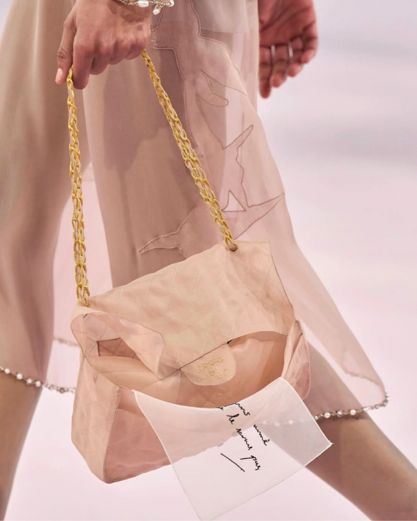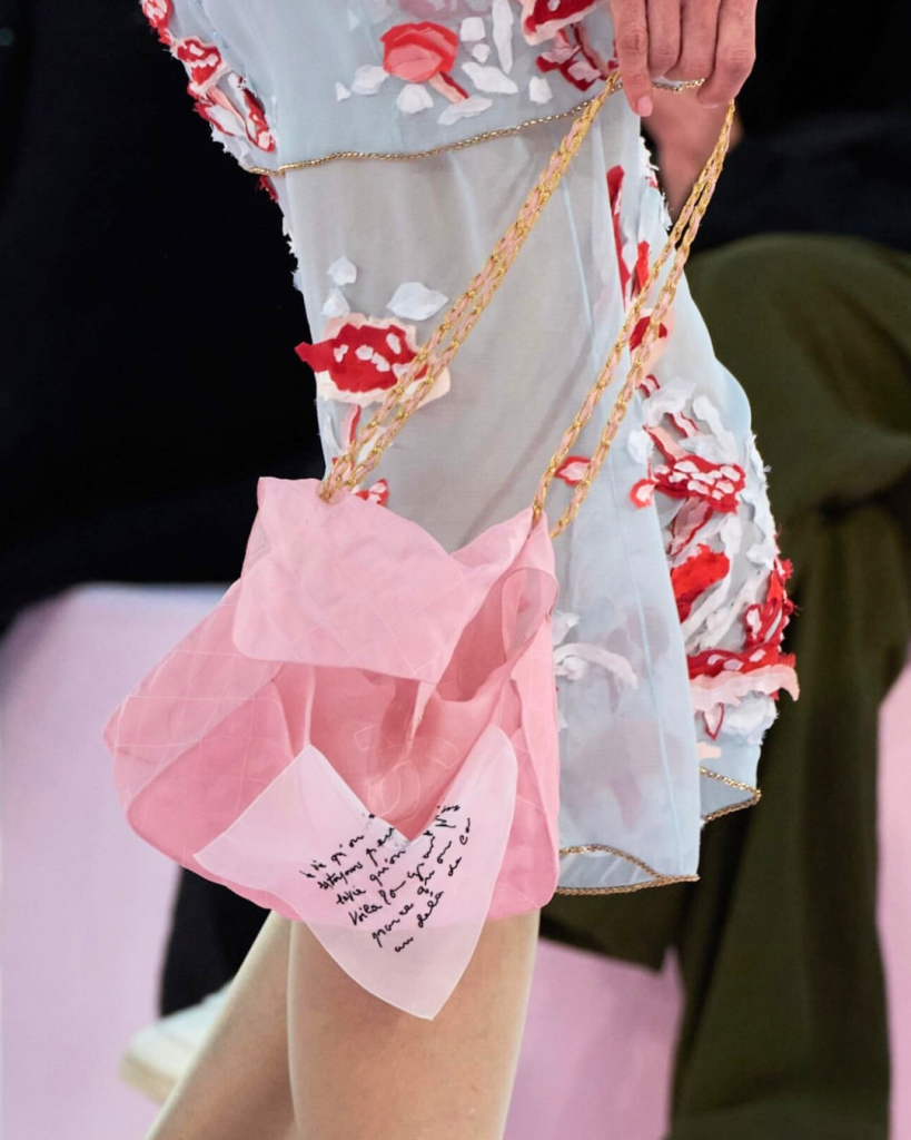 Les accessoires jouent un rôle clé dans cette écriture couture. Les sacs, réalisés en mousseline deviennent de véritables objets poétiques. À l’intérieur, des messages apparaissent comme des confidences glissées au cœur du défilé. Ces sacs ne sont pas de simples compléments : ils prolongent le récit et renforcent cette idée d’intimité mais aussi de liberté.