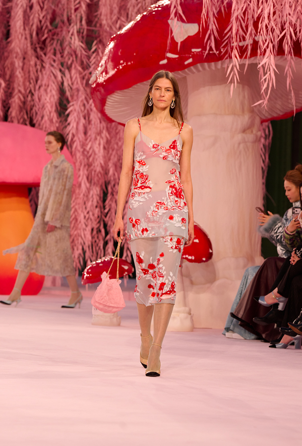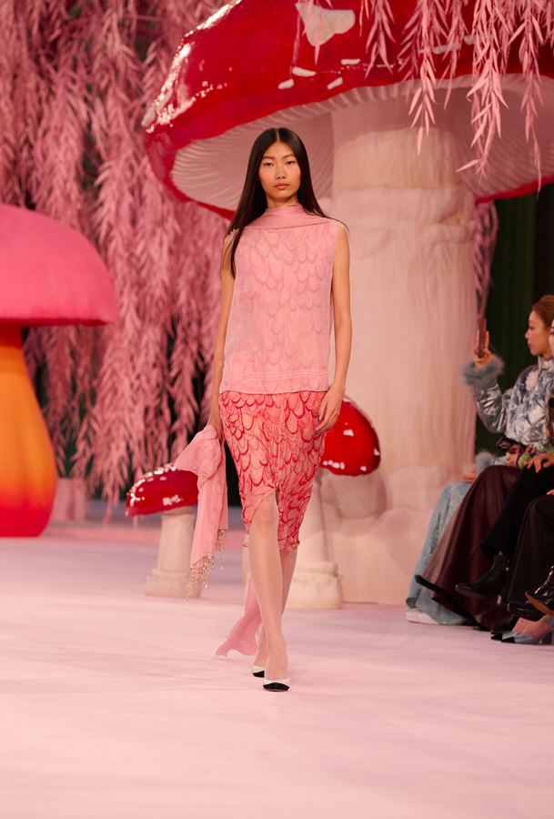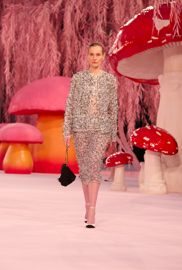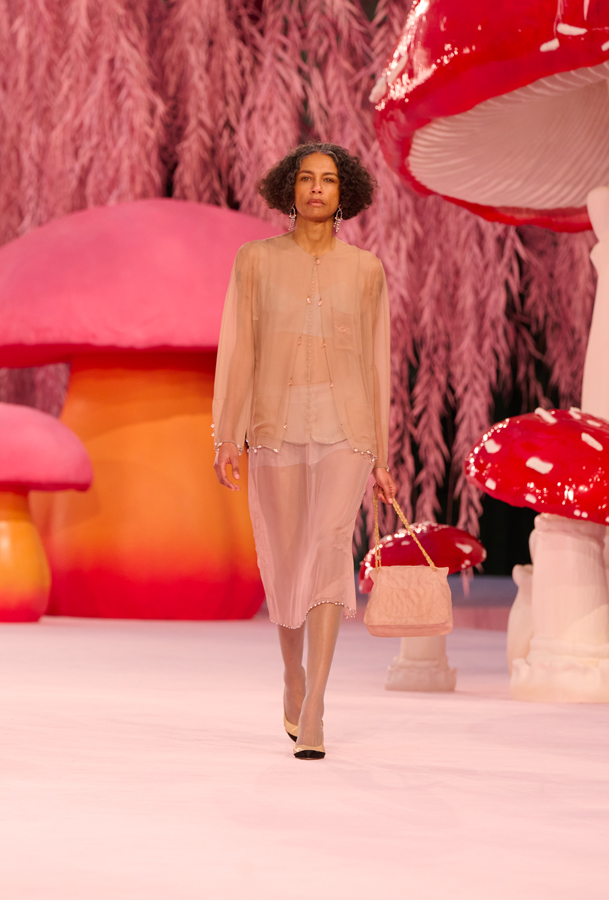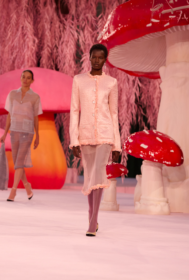 Pour son tout premier défilé Chanel haute couture, Matthieu Blazy installe une atmosphère suspendue, presque irréelle. Sous la verrière du Grand Palais, la scénographie évoque une forêt féérique de saules et de champignons, baignée d’une lumière douce.