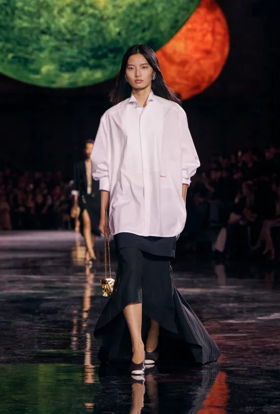 Cette première collection de Matthieu Blazy mélange classicisme et spontanéité. Entre vestes structurées, chemises fluides et jeux de volumes aérien, il revisite le vestiaire Chanel avec une liberté nouvelle. Le tailoring se détend, les matières se bousculent et les détails (plumes, fleurs, franges) donnent du mouvement.