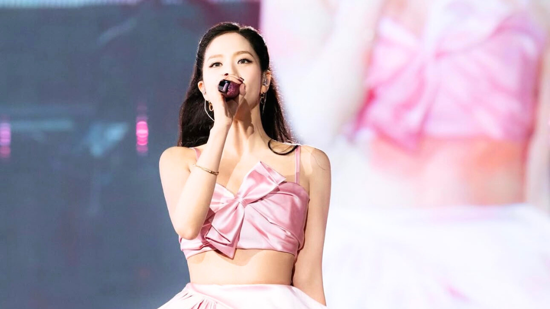 L’ensemble entièrement rose se compose d’un crop top en satin noué à l’avant, d’une mini-jupe plissée assortie et de bottes hautes noires, contrastant avec la douceur du look. Un look à la fois féminin, affirmé et pensé pour capter la lumière en parfaite harmonie avec l’énergie du groupe sur scène.
