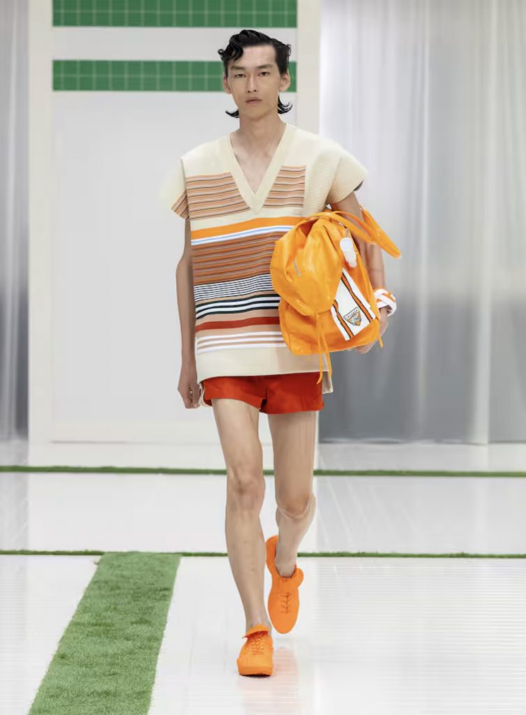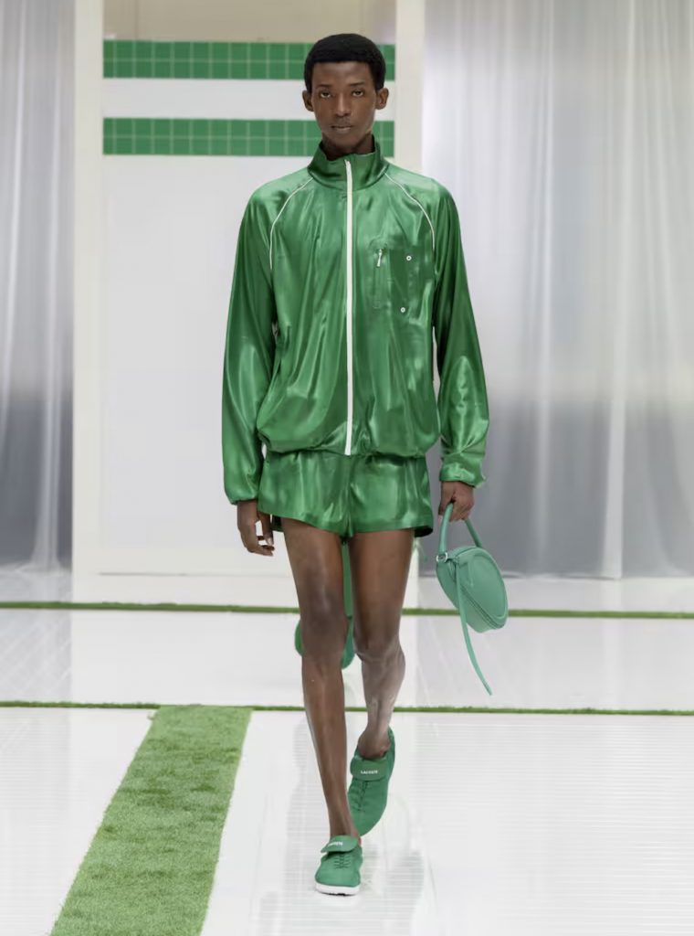Vêtu d’un costume oversize d’un vert profond, il incarnait à la perfection l’esprit du nouveau Lacoste : moderne, sophistiqué et assuré. Les lignes fluides de la tenue soulignaient une silhouette libre, tandis que les textures jouaient sur un équilibre entre minimalisme et audace.