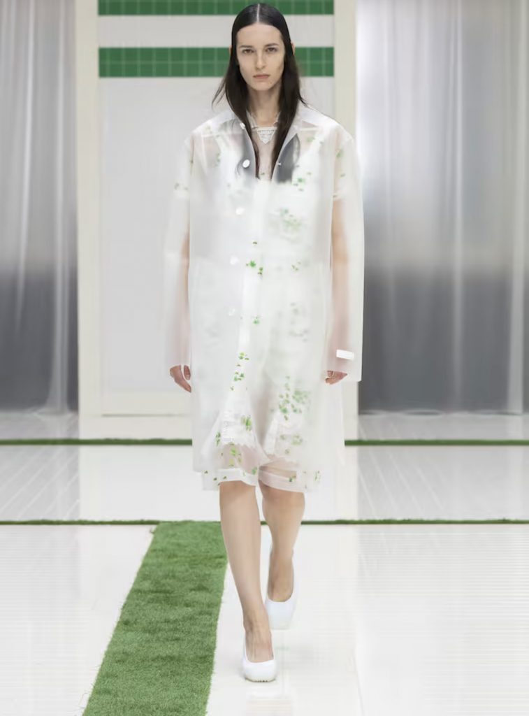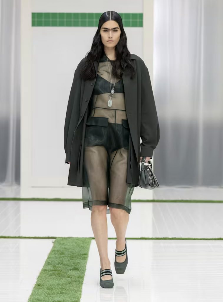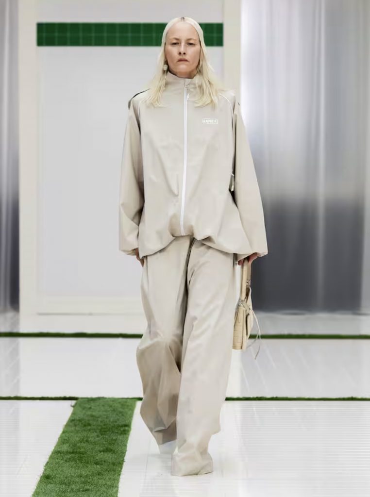 Lacoste revisite son héritage sportif avec une palette audacieuse : rouges brûlés, verts iconiques et bleus franc. Coupes oversize, layering technique et silhouettes athlétiques réinventées. Le trench devient fluide, le polo se transforme en robe et les pièces utilitaires se parent de cordons, poches XXL et matières brillantes.