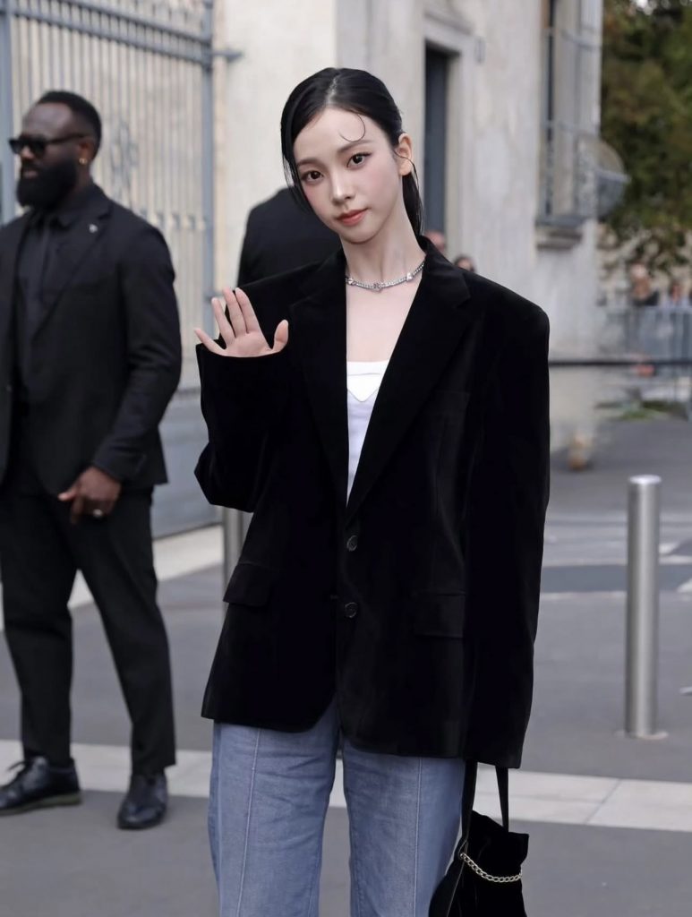 Habillée en Prada Fall/Winter 2025, elle a surpris par un look puissant et affirmé : blazer oversize, pantalon et talons, un ensemble qui tranche avec les silhouettes plus féminines et délicates qu’elle arbore habituellement. Cette nouvelle allure apporte une dimension forte à son image, entre élégance affirmée et indépendance.