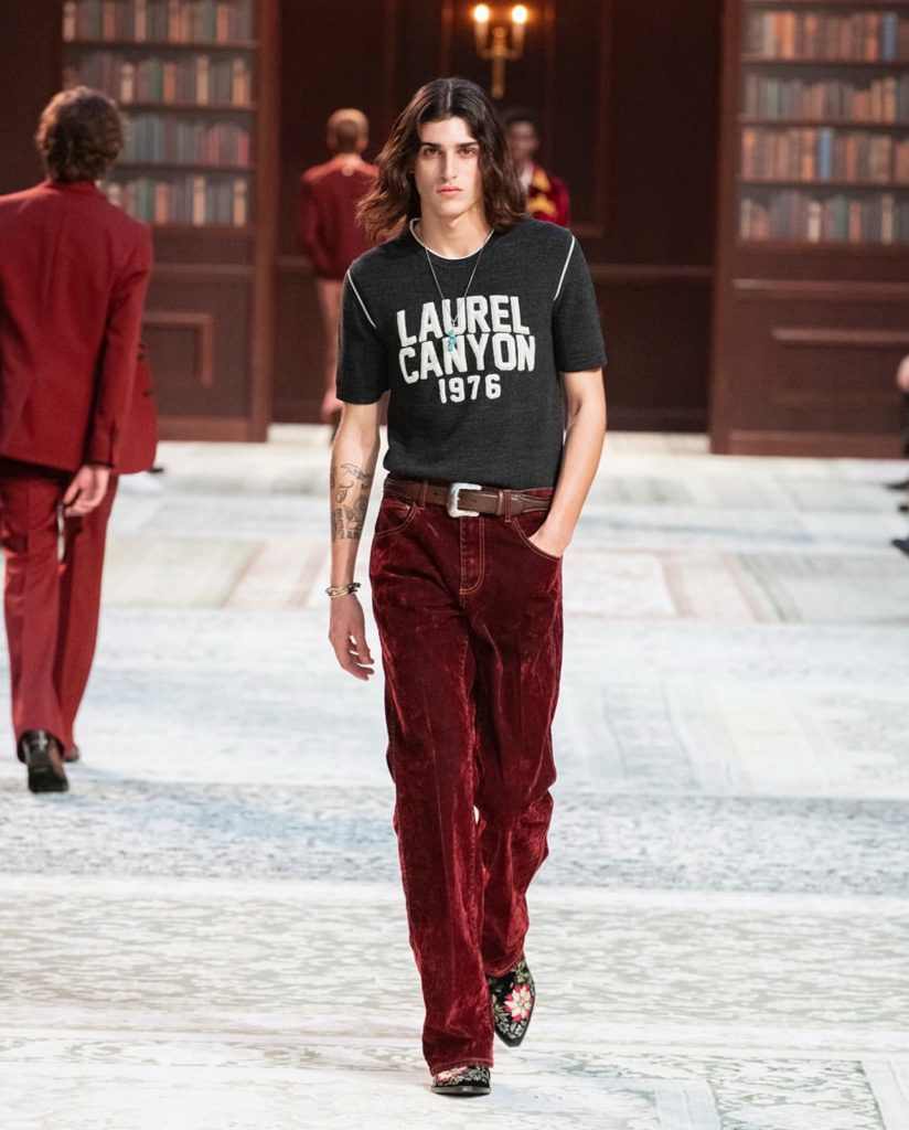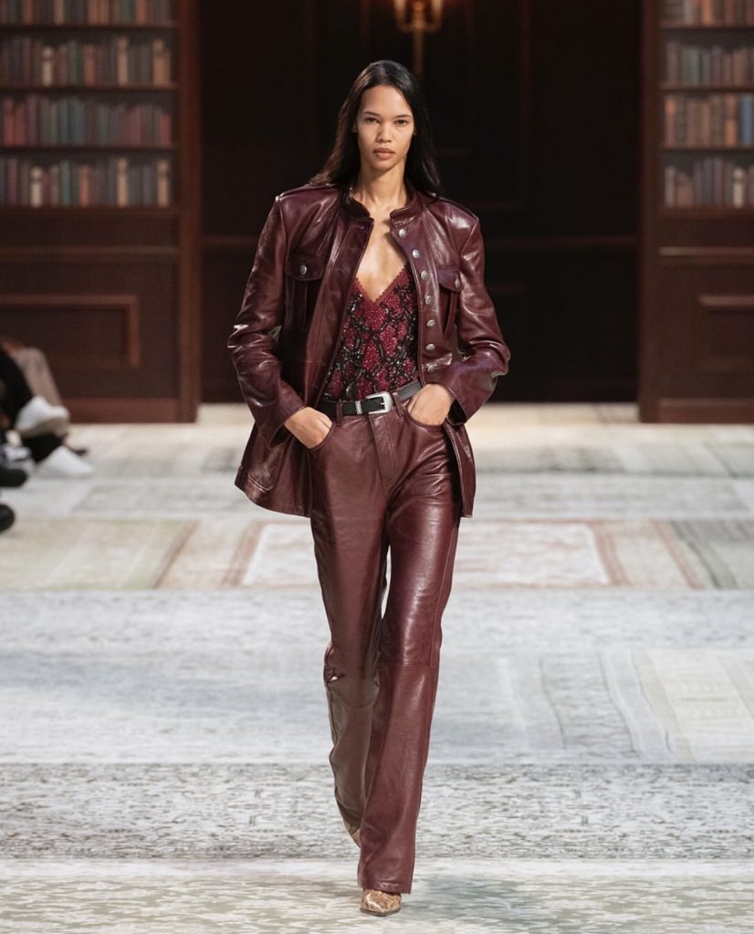 La palette dominée par des tons profonds : bordeaux, merlot, noir évoque une élégance nocturne avec des rappels cinématographique. Les références aux années 1970 s’invitent discrètement, modernisées par des coupes nettes et une attitude moderne.