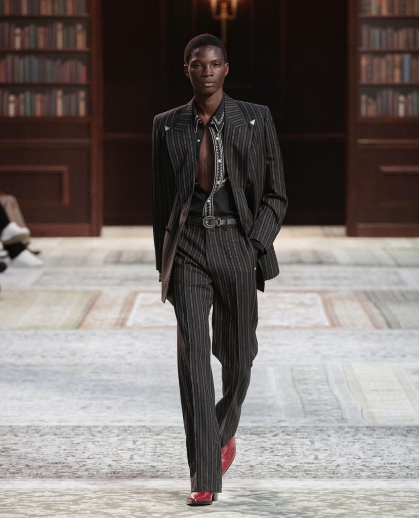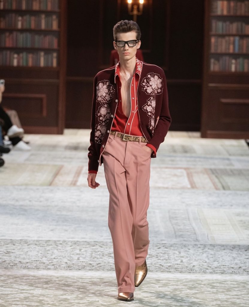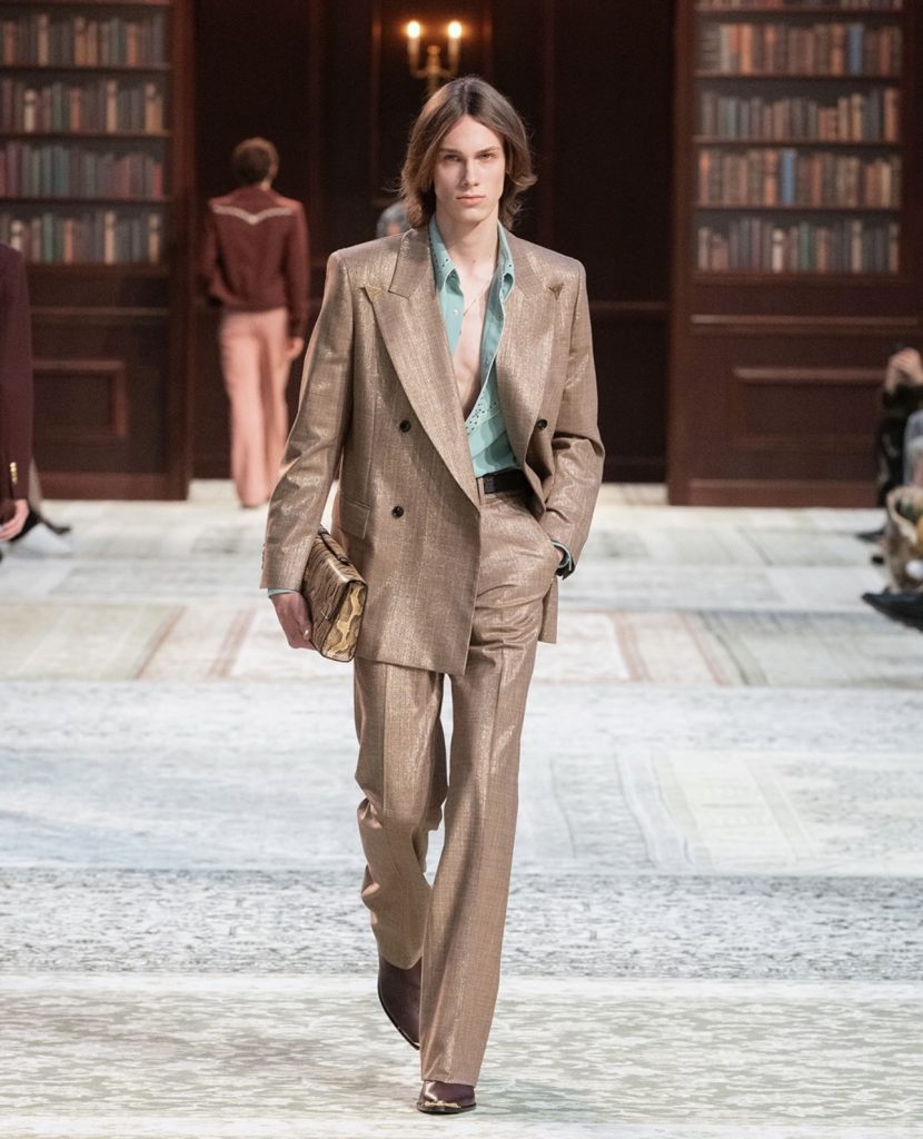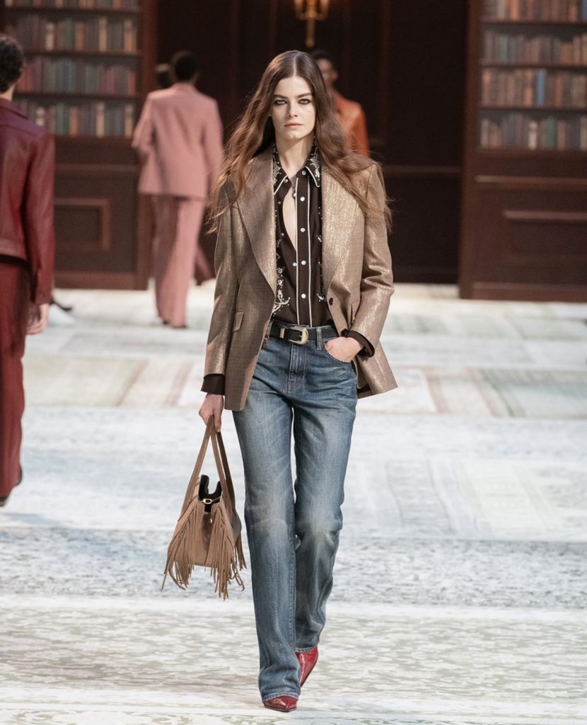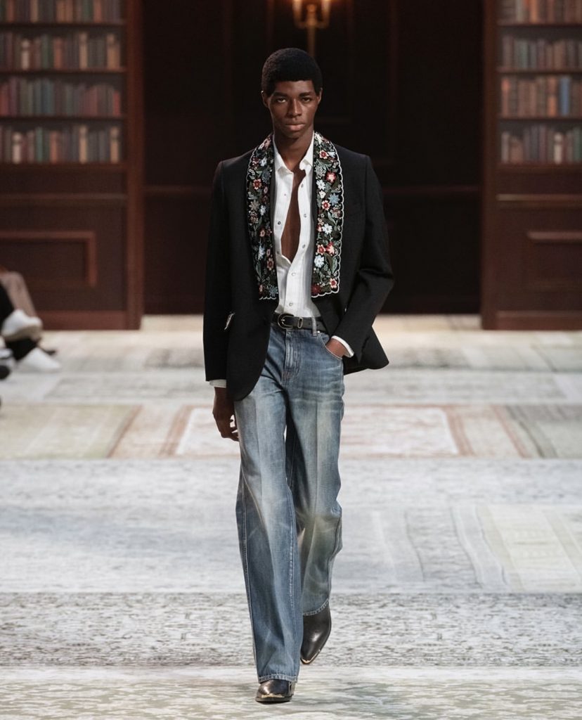 Le tailoring, signature de la maison s’assouplit. Blazers associés à des jeans, pantalons fluides, cuirs souples et matières légères composent un vestiaire pensé pour le mouvement. Les broderies et finitions se découvrent de près, renforçant cette idée d’intimité.