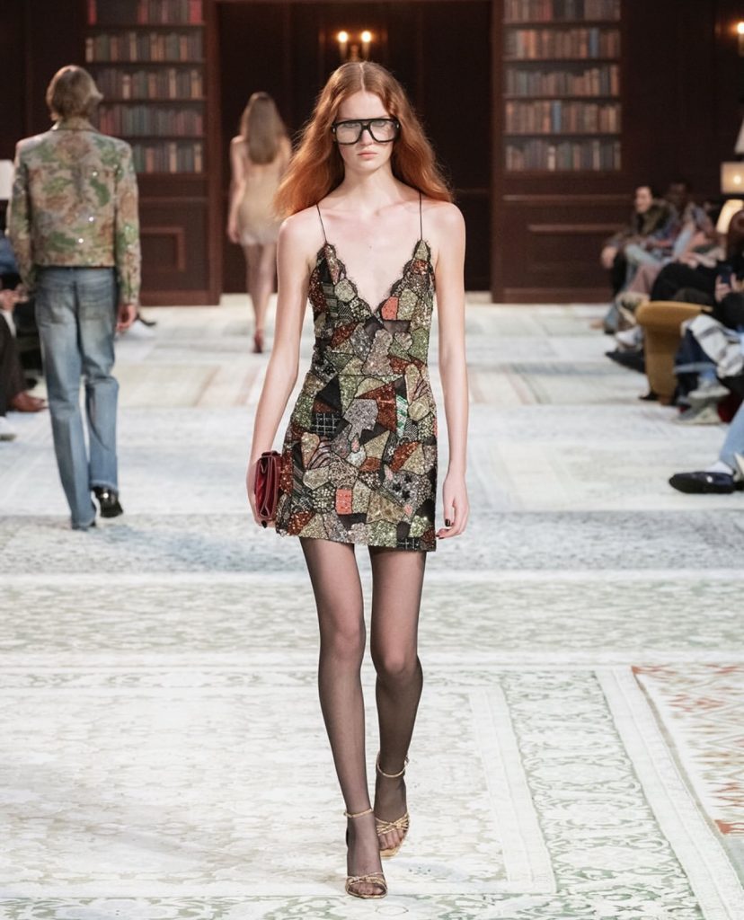 Sur le podium, les vêtements se portent avec aisance. Chemises déboutonnées, décolletés en V, tops ajourés, dentelle apparente, vestes laissées ouvertes : l’ouverture devient un détail clé. Le glamour s’exprime dans la façon de porter les pièces, il est naturel et non forcé et surtout pas dans le too much.