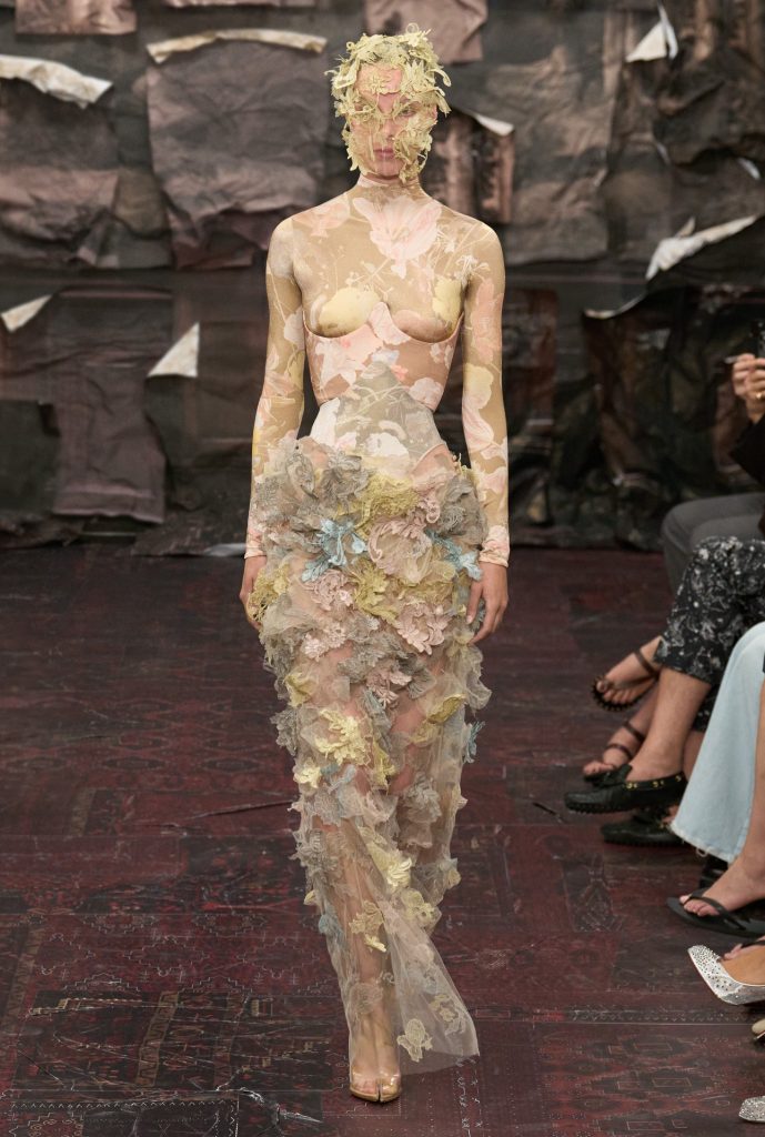 Le look avant-gardiste et raffiné, se composait d’un body en satin stretch imprimé de peintures florales de nature morte associé à une longue jupe en tulle. L’ensemble était complété par des Tabi Claw boots transparentes, rappelant l’ADN de Margiela.