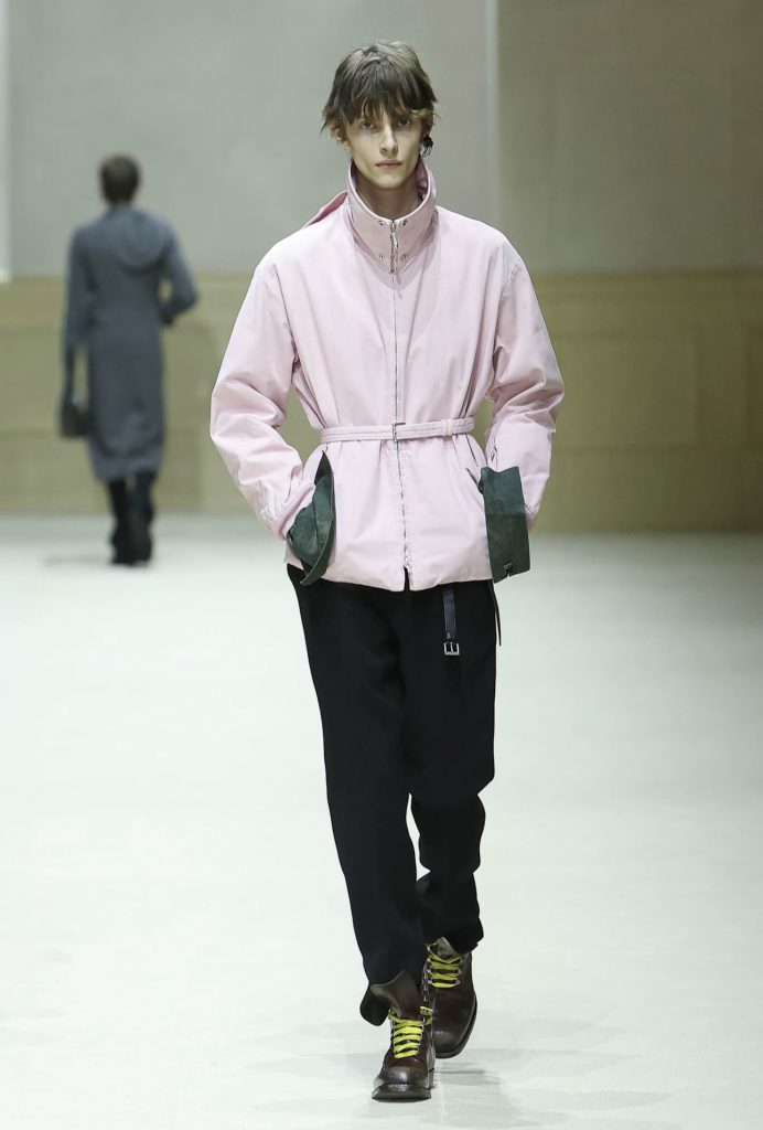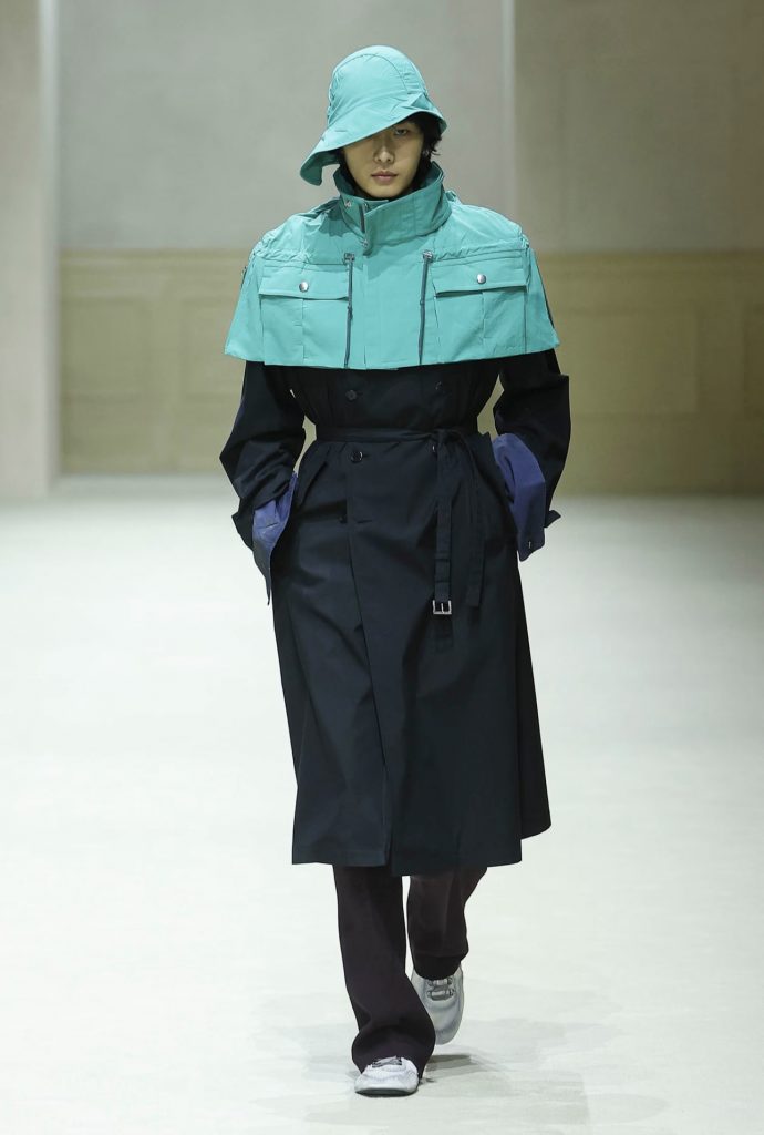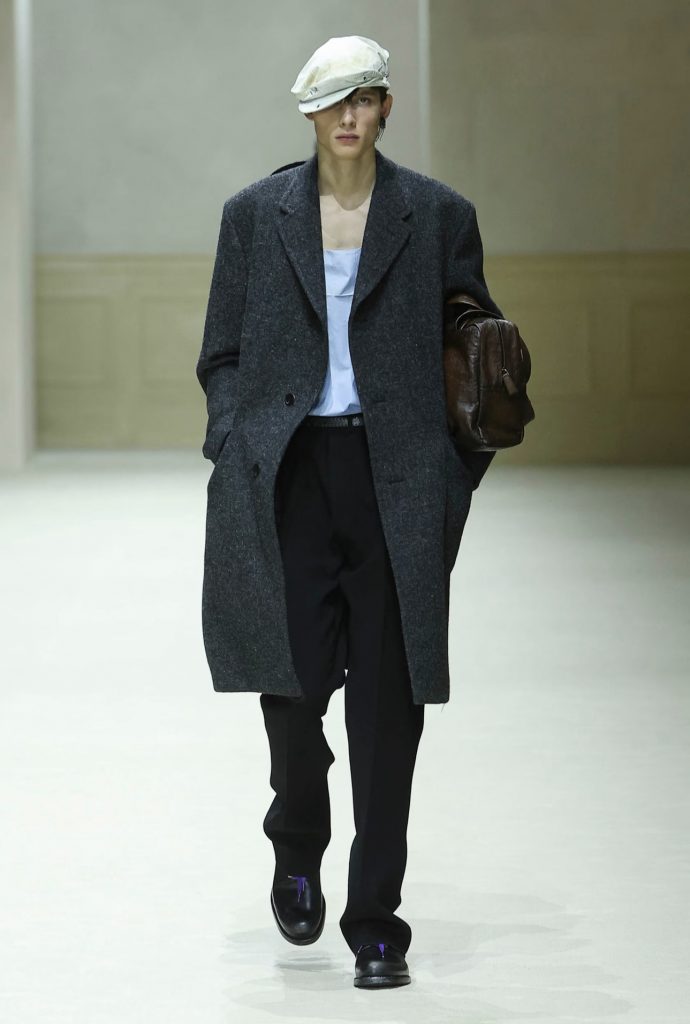 La collection se structure autour d’une garde-robe volontairement resserrée. Les manteaux occupent une place centrale : longs, souvent ceinturés, aux lignes nettes. Les manches s’étirent et dépassent, accentuant cette impression de protection. La palette reste sobre, dominée par des marrons, des bleus profonds, des gris et des beiges, ponctués de touches plus douces ou plus vives, utilisées avec parcimonie.
