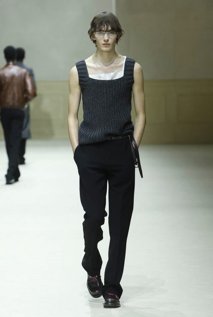 Un élément clé de la collection réside dans son absence de compromis. D’un côté, des silhouettes entièrement couvertes. De l’autre, des looks qui exposent épaules et bras. Il n’y a pas de transition progressive entre ces deux registres. Prada assume le contraste sans chercher à l’adoucir.