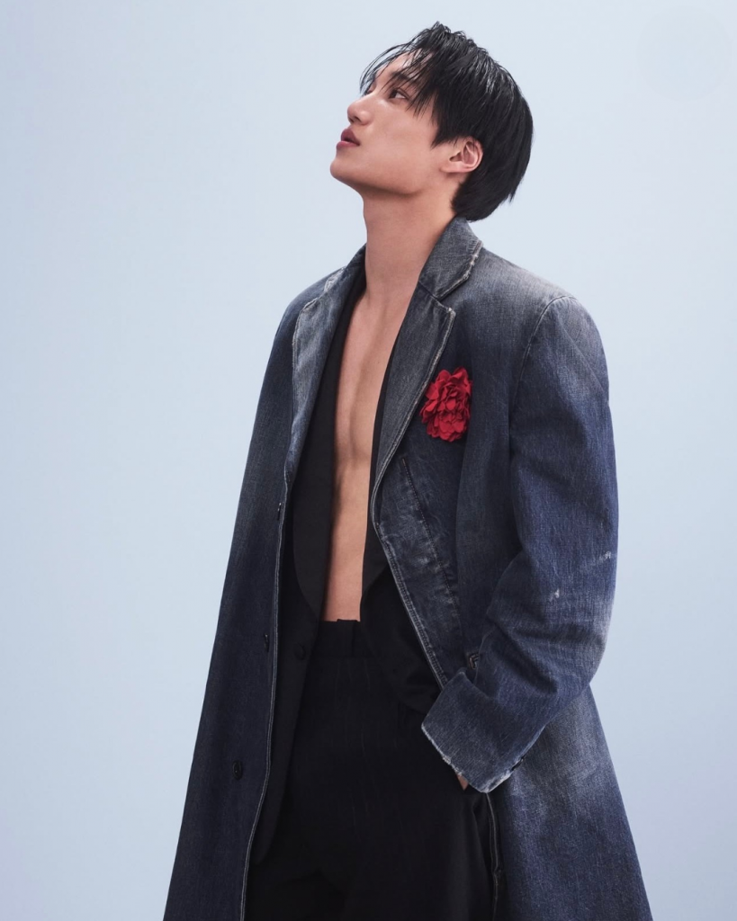 Très attendu, Kai a signé son retour à la Fashion Week au défilé Prada après une longue absence due à son service militaire. Il a fait sensation dans un long manteau en denim, porté sur un ensemble noir à col ouvert, ponctué d’un détail floral rouge vif. Une allure affirmée, charismatique, fidèle à son style et à l’univers de Prada.