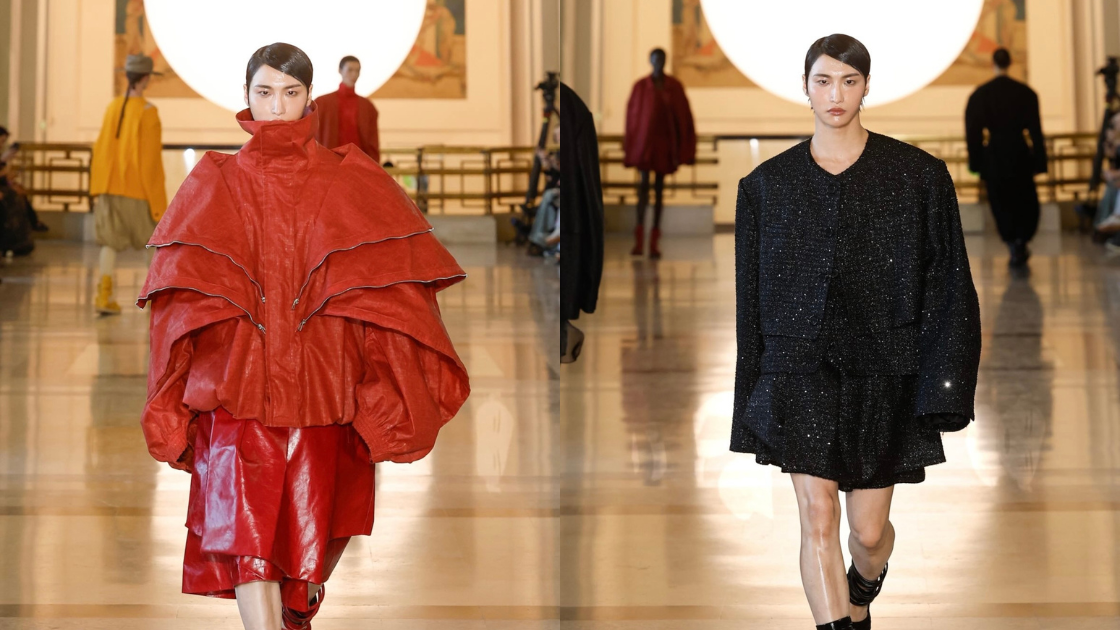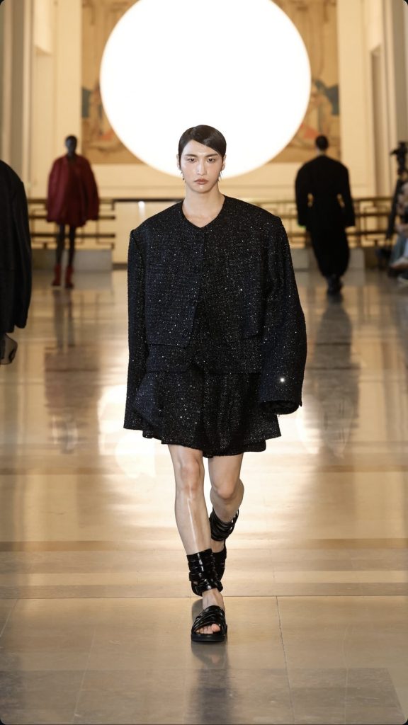 Deux passages, deux looks et une même intensité. Cheveux plaqués, regard assuré, il a captivé l’audience dès ses premiers pas. D’abord dans un ensemble rouge sculptural aux volumes puissants, puis dans une tenue noire à paillettes à l’élégance sobre et magnétique. Une démonstration de versatilité maîtrisée servie par une allure naturelle.