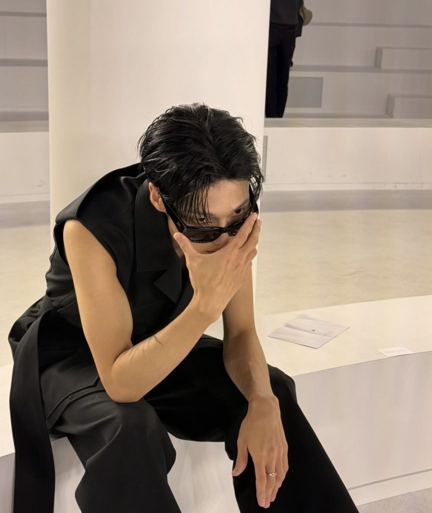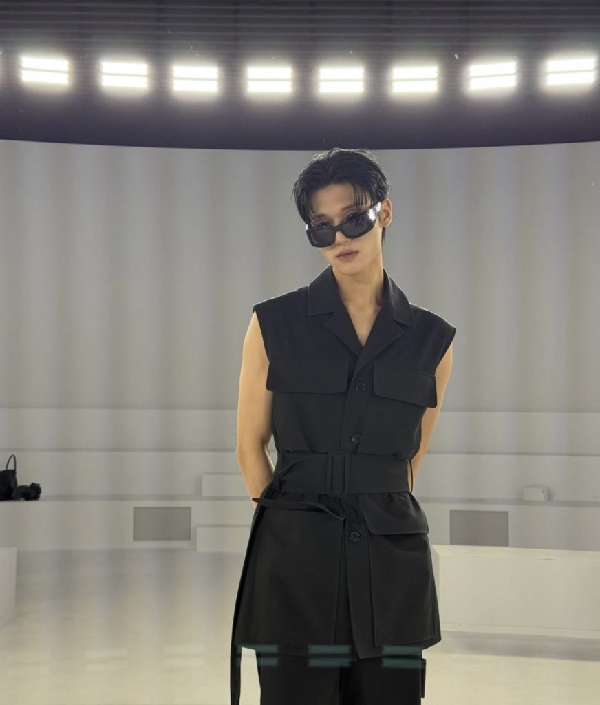 Pour la présentation de la collection Printemps-Été 2026, Wooyoung a opté pour un look full black, minimaliste et affirmé. Silhouette élancée, allure magnétique et attitude assurée : il incarne avec aisance cette modernité que Courrèges met en avant saison après saison.